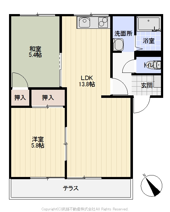 2020年7月にリフォーム @キッチン・洗面台を交換。 A壁・天井クロス・床CF(玄関、キッチン、トイレ)の貼替え。 Bエアコン・照明器具を交換。 |